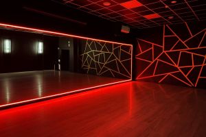 Потолки 5 метров, дизайн интерьера очень оригинальный и презентабельный, в стиле лофт. Пол паркет, мужская, женская и тренерская раздевалки, 2 колонки Sony, 2 кондиционера, на потолке гирлянда (более яркая) и светильники в индустриальном стиле (менее яркие), зеркала по обе стены.